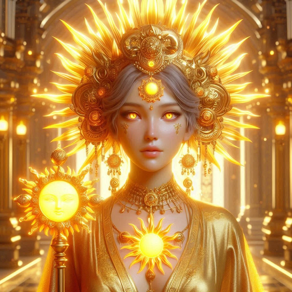 A hyper-realistic 3D character of a radiant priestess, her skin glowing with the warmth of the sun. Her eyes are bright, golden orbs, exuding a serene, divine power. She is adorned in robes of golden silk, with intricate sunburst patterns that seem to emit light. Her headdress is a majestic, ornate sun disk, glowing with intense solar energy. She carries a scepter topped with a miniature sun, which blazes with vibrant, fiery light. The background is a grand temple bathed in sunlight, with every ray of light and shadow rendered in stunning detail, capturing her divine connection to the solar realm.