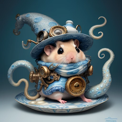 award winning photograph of a Dzungarian hamster in an adventurer's hat with slimy tentacles made of blue and white porcelain in wonderland, magical, whimsical, fantasy art concept, steampunk, intricate details, best quality, masterpiece, ultra shartp, hyper realistic, realism