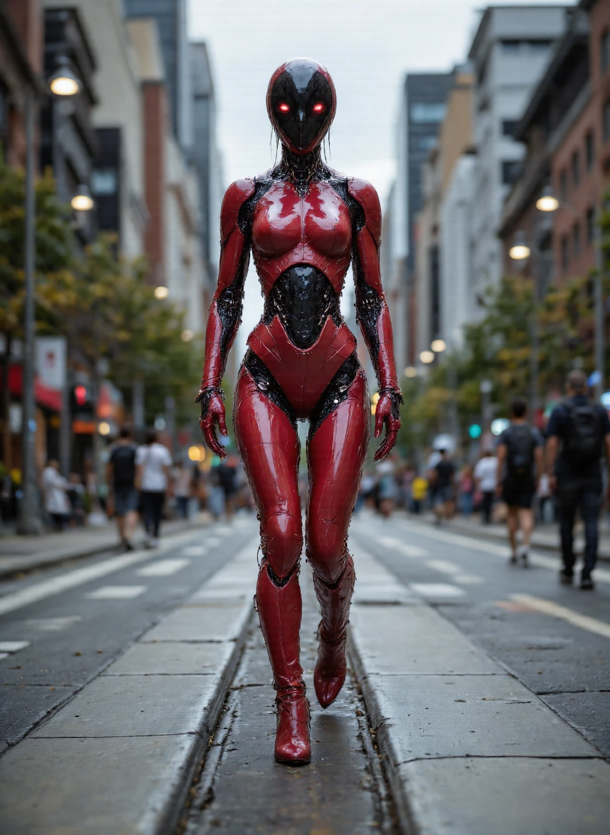 The image depicts a humanoid woman robot walking down an urban street. The robot has a sleek, metallic body with a predominantly red and silver color scheme. Its design features a glossy finish, giving it a futuristic appearance. The head of the robot is black with a circular red visor or camera lens at the front. The robot's limbs are jointed, allowing for movement similar to that of a human. It wears high-heeled boots that match its red color, adding a stylish touch to its overall look. The background shows a cityscape with buildings, trees, and pedestrians, suggesting this scene takes place in a bustling urban environment.