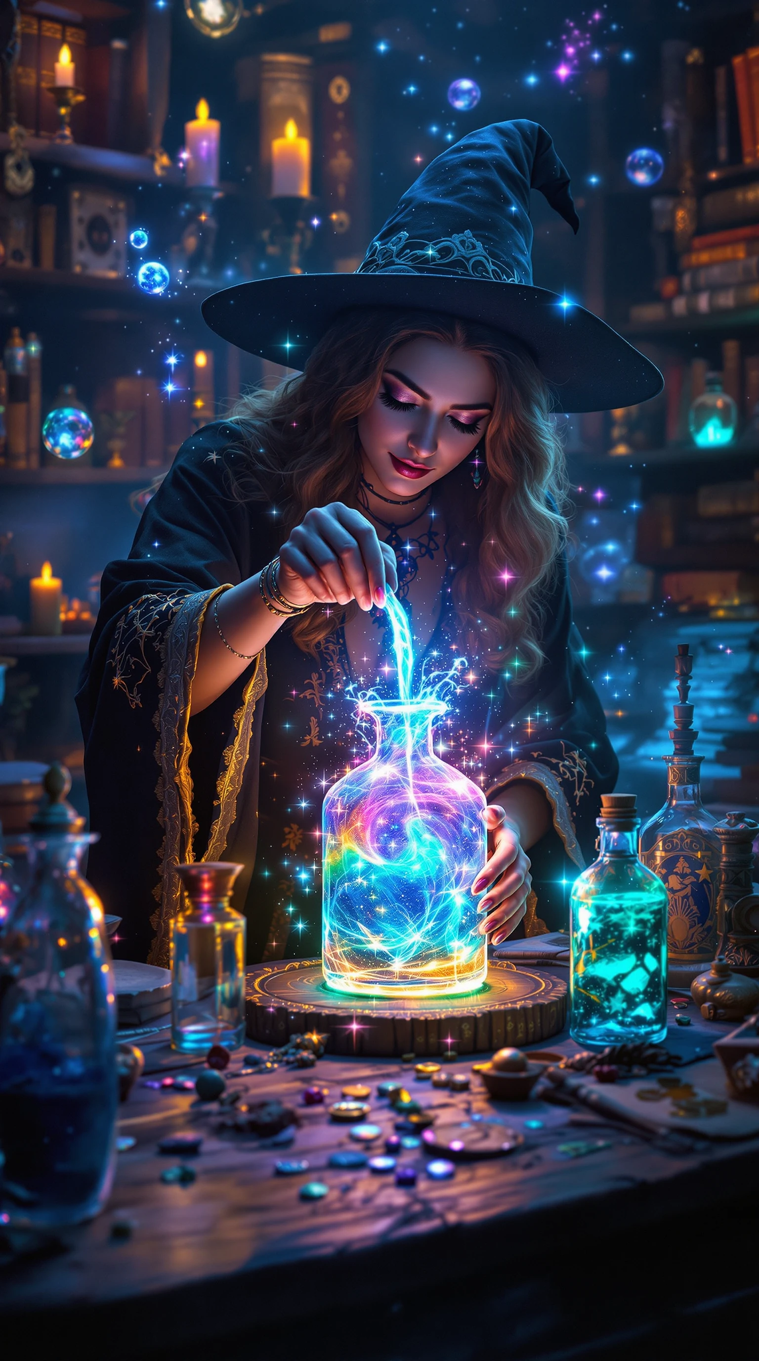 A **mystical witch’s potion room**, dimly illuminated by the **ethereal glow of enchanted candles and floating orbs of light**. Shelves overflowing with **ancient tomes, crystal vials, and arcane ingredients** line the walls, exuding a sense of **wisdom and mystery**.
