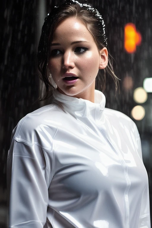 detailed and realistic photograph of Jennifer Lawrence, (( wet white pvc shirt 1, 4) ), ((mouth closed 1, 1) ) light wrinkles, crying, head tipped down, wet, rain, night time, dark, bokeh, photo realism, photoshoot model pose, ultra-detailed, sony 35mm, f1. 8, dark overall scene, soft focus, urban setting, not in middle of street, alleyway, dark corner, neon signs, detritus, mouth closed, sad, intense look, looking at camera, moist, soft light, low highlights, wet hair