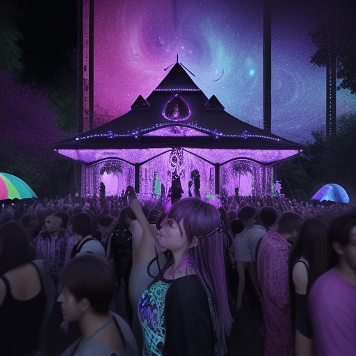 Hyper realistic eye level exterior photo of a person dacing on a psytrance party, night, psychedlic, lsd , a lot of people, big party