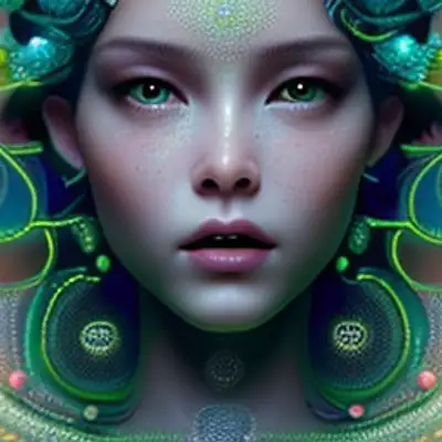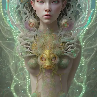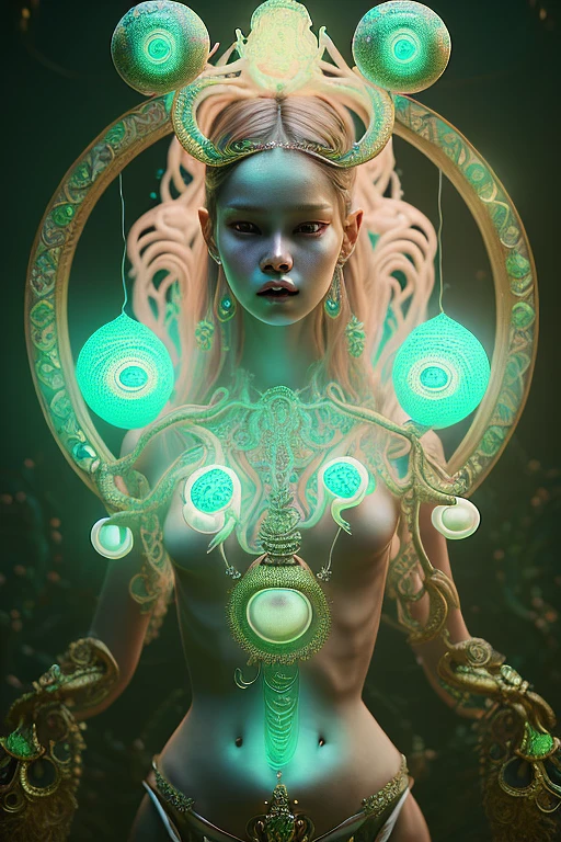 photography by Marcin Nagraba, beautiful ornate female god inspired by lisa from blackpink of organic pearls and lace with ornate glowing mushroom headset and glowing elegant horned beetle covering dangling from neck, light blue and green color gel lighting, geometric shadows on face, Alphonse Mucha, details and composition by Rebecca Millen, unreal engine