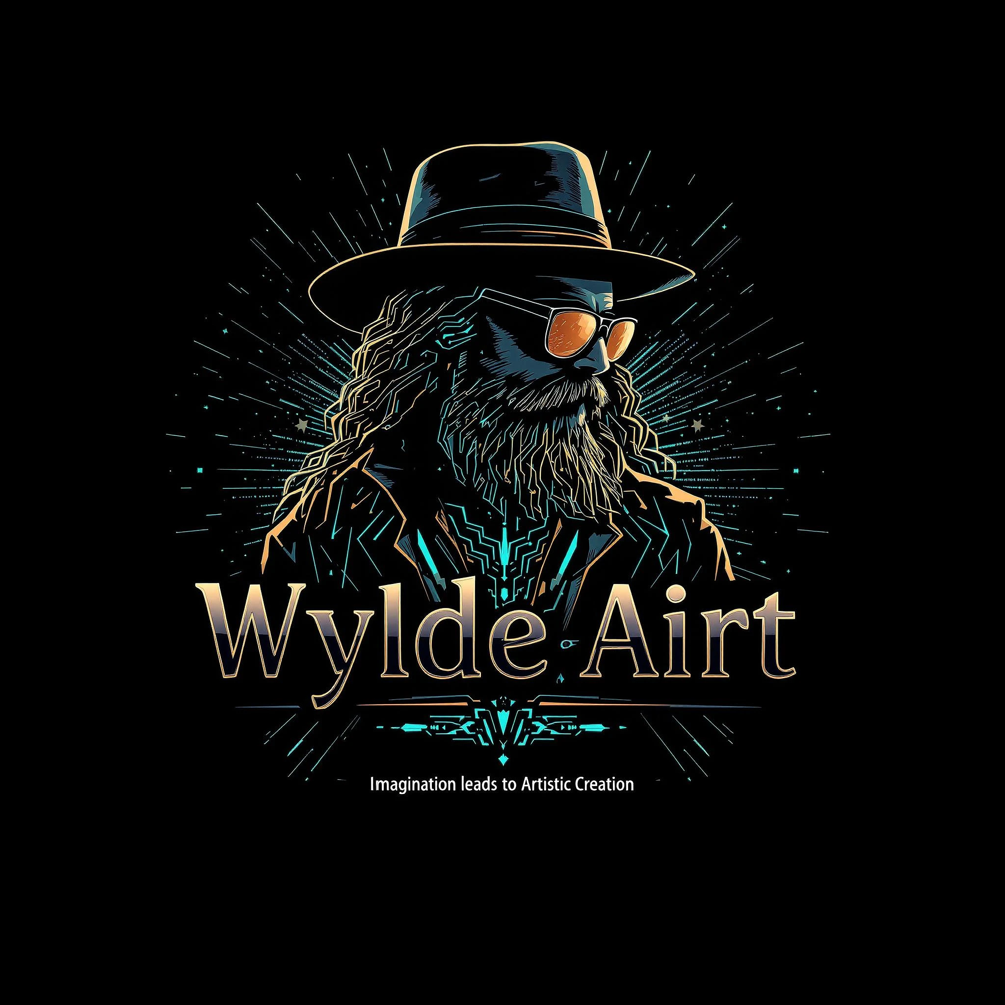 Create a high-impact, retro Steampunk logo for the brand "Wylde Airt", preserving the following visual structure: Central Symbol: Design a stylized, hippie profile, steampunk sunglasses and a battered Fedoro tilted down over his left eye silhouette emerging from a digital vortex or burst of data shards. The figure should be a stylized profile of Leonardo da Vinci but abstract, with tech-inspired detailing such as embedded circuits, etched lines, or subtle neon seams along the limbs and chest — symbolizing the fusion of human creativity and AI power. The data vortex behind or around the figure should appear like fragmented code or holographic layers, evoking dynamic intelligence and innovation. Typography: The brand name must be written exactly as “Wylde Airt” — with capital “W” and “A”, the rest lowercase. Use an elegant, funky retro serif or a groovy funky-luxury hybrid font. Apply a reflective psychedelic metallic finish, with subtle teal or electric blue glows or accents, to convey innovation and digital sophistication. Tagline: “Imagination leads to Artistic Creation. ” Position directly beneath the brand name in a clean, smaller cursive font. Match the metallic gradient and apply the same color accents to maintain cohesion. Background: Use a dark slate or matte black background with possible faint geometric patterns or circuitry etched into the backdrop to add depth and contrast — making the metallic elements and glow effects stand out. Overall Feel: Premium, bold, and visionary. Avoid generic AI symbols, mascots, or cartoon-like elements. Focus on a sleek, custom, and ownable design language that reflects cutting-edge creativity and power.