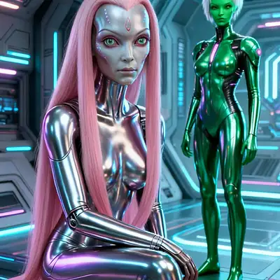 Change image characters into an elegant, refined image of human culture. Change expressive and emotional depth. Change background, clothing, hairstyle, and pose to emphasize sleek comfort within a futuristic society. Changing and blending faces to create a male and female different than the originals. If multiple characters, switch the characters' sides. Remove all banners and tagline wording. Create an Unreal Engine 5 Ultra-realistic—intelligent, regal, harmonious, innocent, and beautiful.