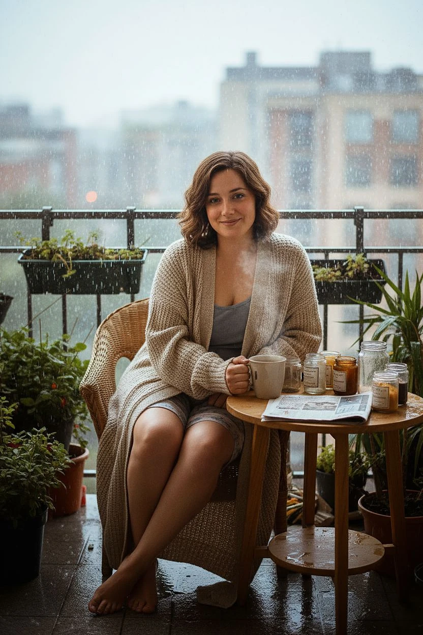 On a small, cluttered balcony during a light rain, the uploaded woman sits on a wicker chair wearing a long oversized beige cardigan over a faded grayish-blue tank top with pajama shorts. A mug of tea with steam rises from the small table in front of her, which also holds a few half-empty jars and a folded newspaper. Raindrops blur the view beyond the railing. She leans toward the camera with a gentle, warm smile, the flash making her skin glow softly against the cozy, messy surroundings. /// Add Highest Quality, photorealistic, 8K ultra-high resolution, Cinematic Lighting .
