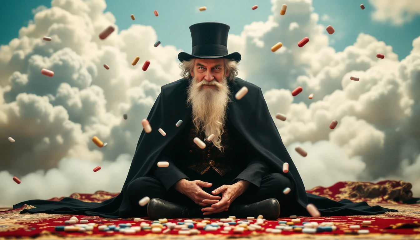 THE MAGICIAN SITTING ON THE CARPET, AGAINST THE BACKGROUND OF CLOUDS, AND PILLS FLYING AROUND HIM