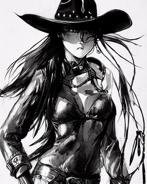 Drawing of cowgirl, black and white, concept art, sumi - e style, artstation, trending, highly detailed, smooth, focus, art by yoji shinkawa