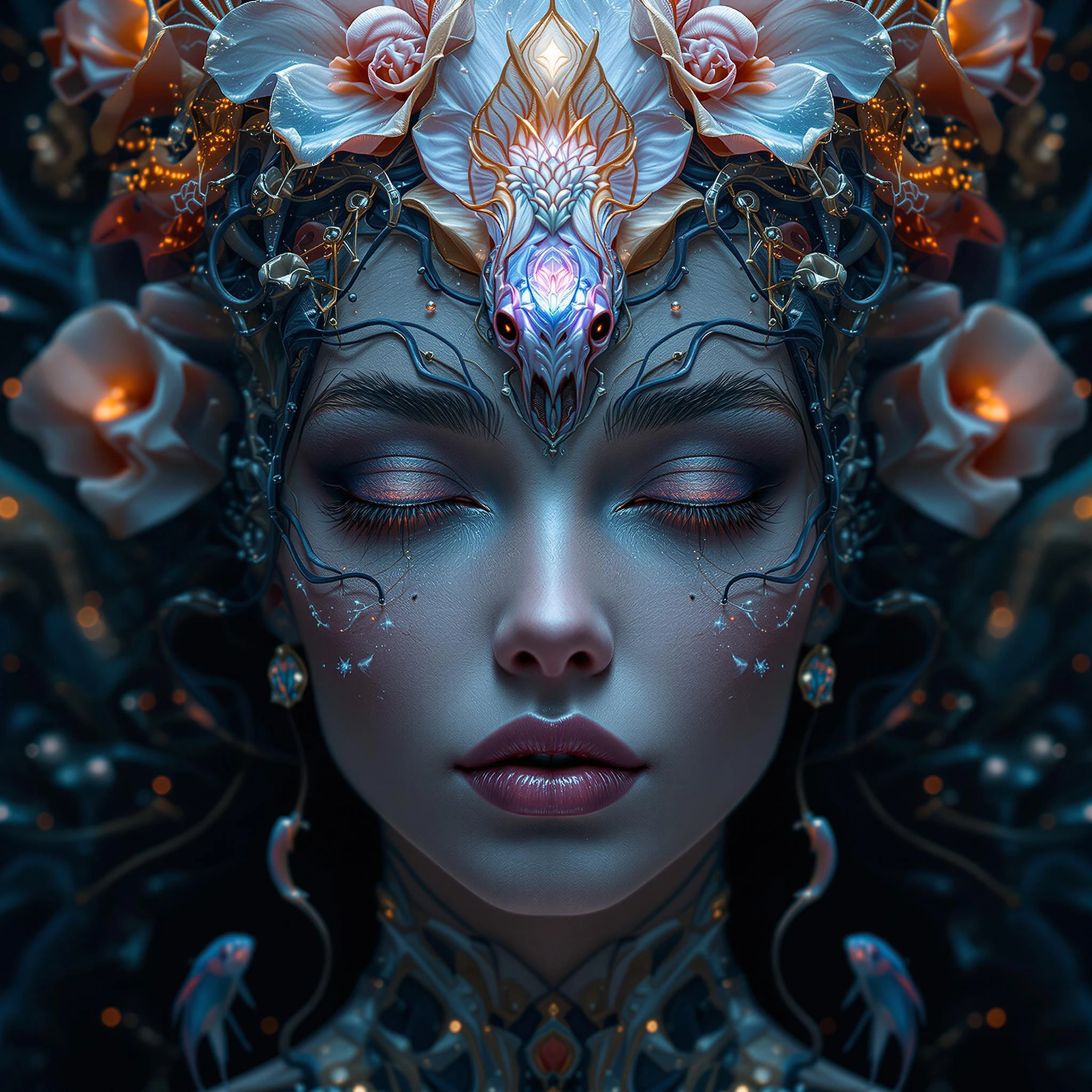 Goddess close-up portrait ribcagel. jellyfish phoenix head, nautilus, orchid, skull, betta fish, bioluminiscent creatures, intricate artwork . octane render, trending on artstation, t symmetrical artwork. cinematic, hyper realism, high detail, octane render, 8k
