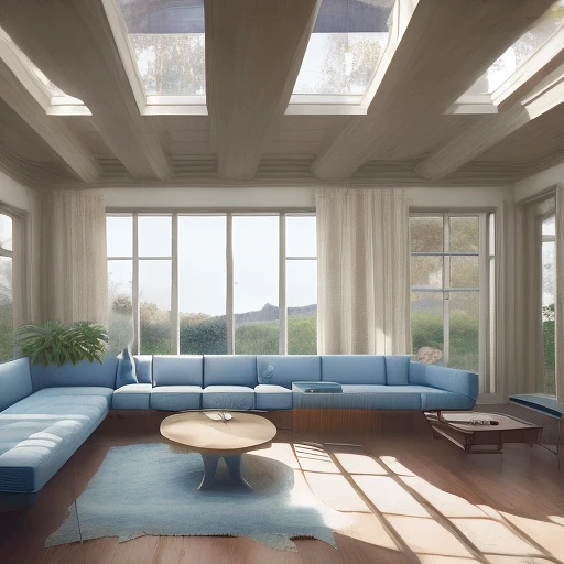 High resolution photography interior design, dreamy sunken living room conversation pit, wooden floor, small windows opening onto the garden, bauhaus furniture and decoration, high ceiling, beige blue salmon pastel palette, interior design magazine, cozy atmosphere; 8k, intricate detail, photorealistic, realistic light, wide angle, kinkfolk photography, A+D architecture