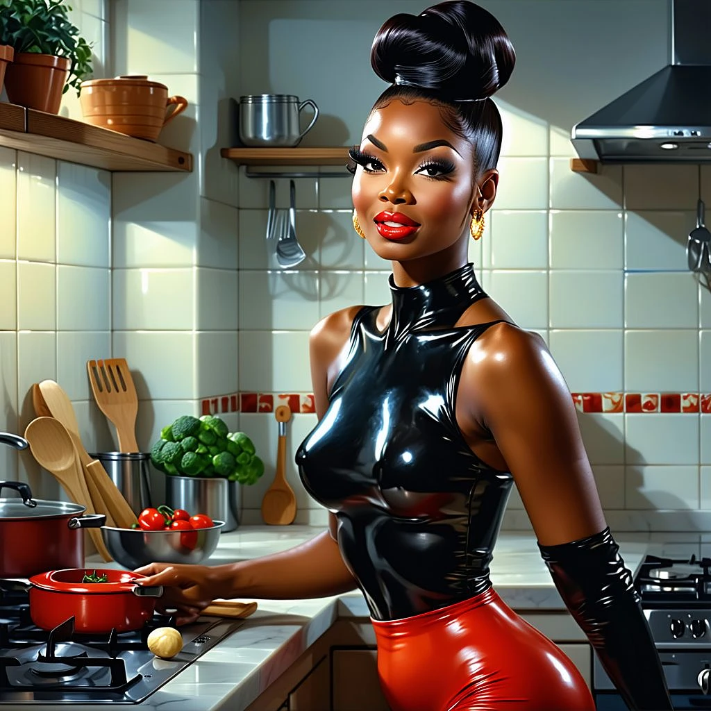 1955, pin up transexual, in a kitchen, cooking, homoerotic , shiny, sassy facial expressions, Ethiopian ebony skin, coloured latex, nsfw, stocking, intricate details,