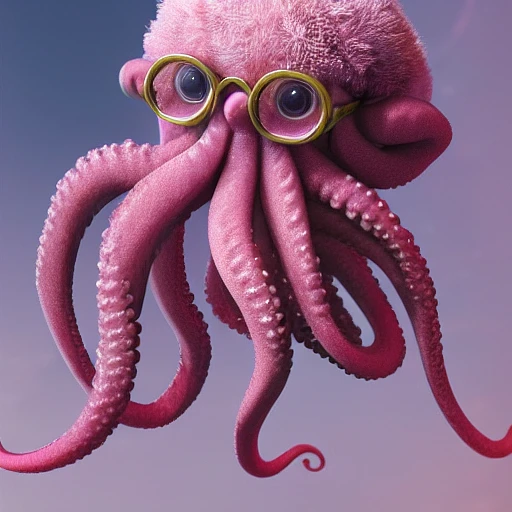 cute baby creature from another universe, wearing glasses, magical and dreamy, cute, octane render, 8k, ornamental cenary, fantasy colors, ultra realistic, fluffy, soft texture, high quality, futuristic cute, octopus cute little fluffy hair : —ar 9:16 —q 3