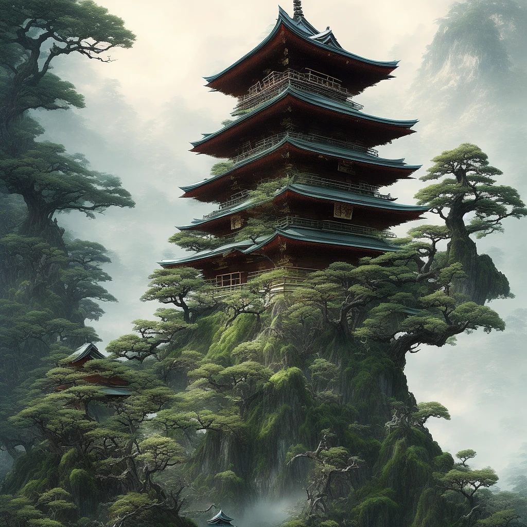 japanese style shrine on top of a misty mountain overgrown, hyper realistic, lush gnarly plants, 8 k, denoised, by greg rutkowski, tom bagshaw, james gurney cinematic lighting