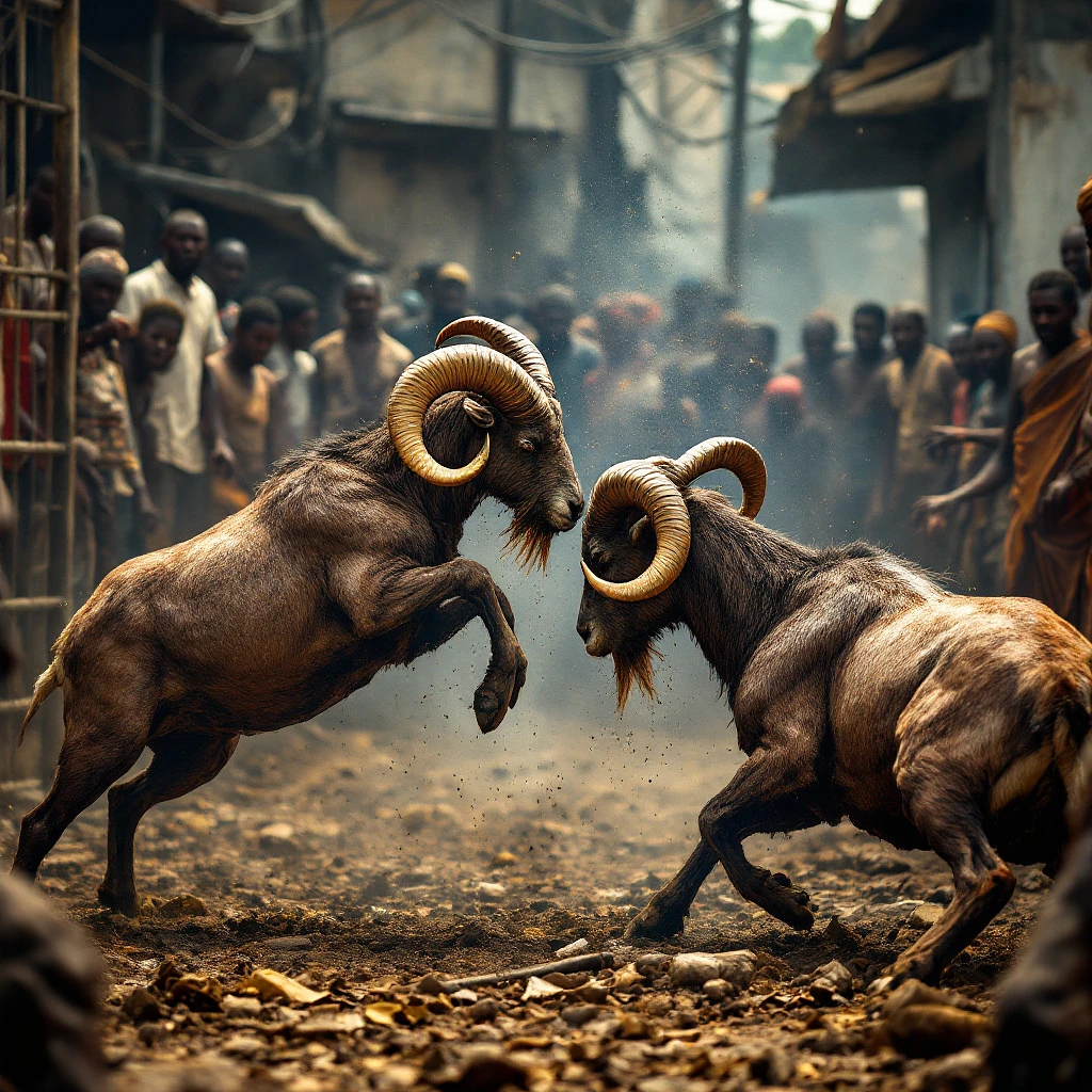 A striking, high-resolution image capturing two rams locked in an intense battle, their powerful horns clashing in the foreground. Nearby, other rams remain confined within a cage, awaiting their turn. The backdrop reveals a gritty urban slum in Lagos Island, Lagos State, Nigeria, where a crowd of spectators eagerly place bets, their expressions a mix of excitement and anticipation, add a caption on it 2025 Ileya Day