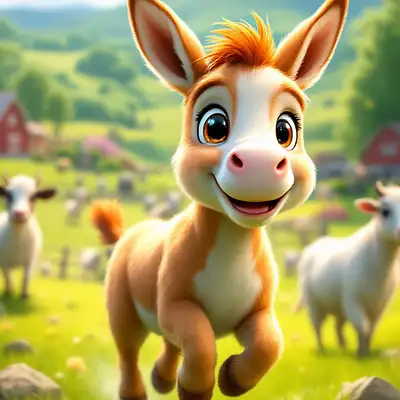 A small, adorable donkey with orange and white fur is flying high in a colorful hot air balloon, enjoying a peaceful ride above a beautiful green countryside. The donkey is standing inside the wicker basket of the balloon, looking out with wide, excited eyes and ears flapping in the breeze. The hot air balloon is decorated with bright colors — red, blue, yellow, and orange panels — floating gently in a soft, blue sky filled with fluffy white clouds. Below, a lush green cattle farm stretches out with cows, goats, and a red barn visible in the distance. The lighting is warm and golden, suggesting early morning or late afternoon. The scene should feel magical and whimsical, like a children's storybook illustration, full of joy and wonder. High-resolution, soft textures, vibrant colors, and a dreamy, cinematic atmosphere.