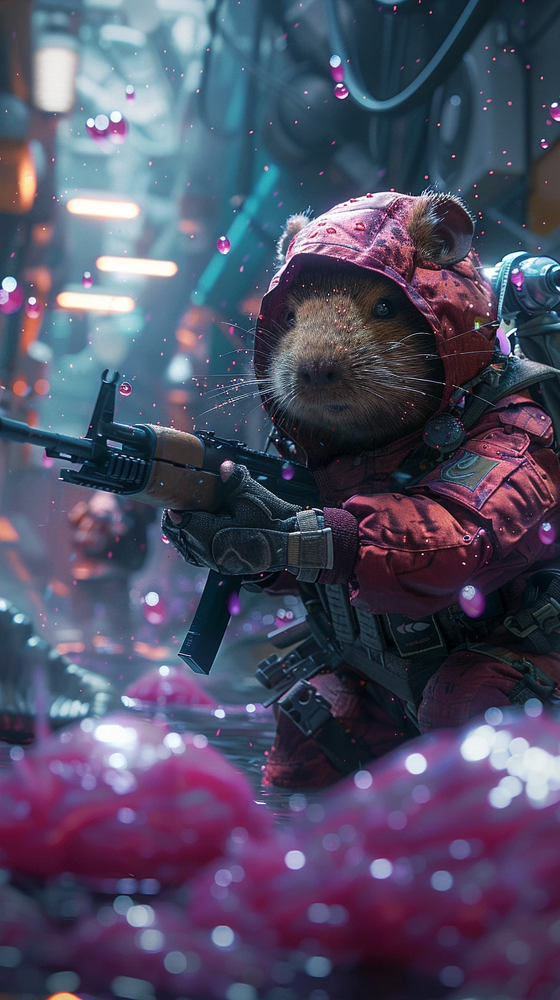 capybara's army, armed with AK-47, with Nike sneakers on their feet, fighting a giant slime, purple slime, 3D image, ultra realistic, unreal engine 5, playstation 5 graphics, extremely specific, 8k resolution