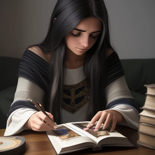 una foto realista, de una chica de 20 años, cabello negro, usando ropa mistica, leyendo las cartas del tarot, un atmosfera esoterica.