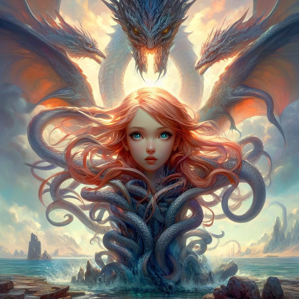A beautiful young split-screen dragon a unique giant kraken coming out of the ground a beautiful magical fantasy painting by Maryam Hashemi, Trends in pixiv Artstation, oil on canvas, 4k, HDR, dr