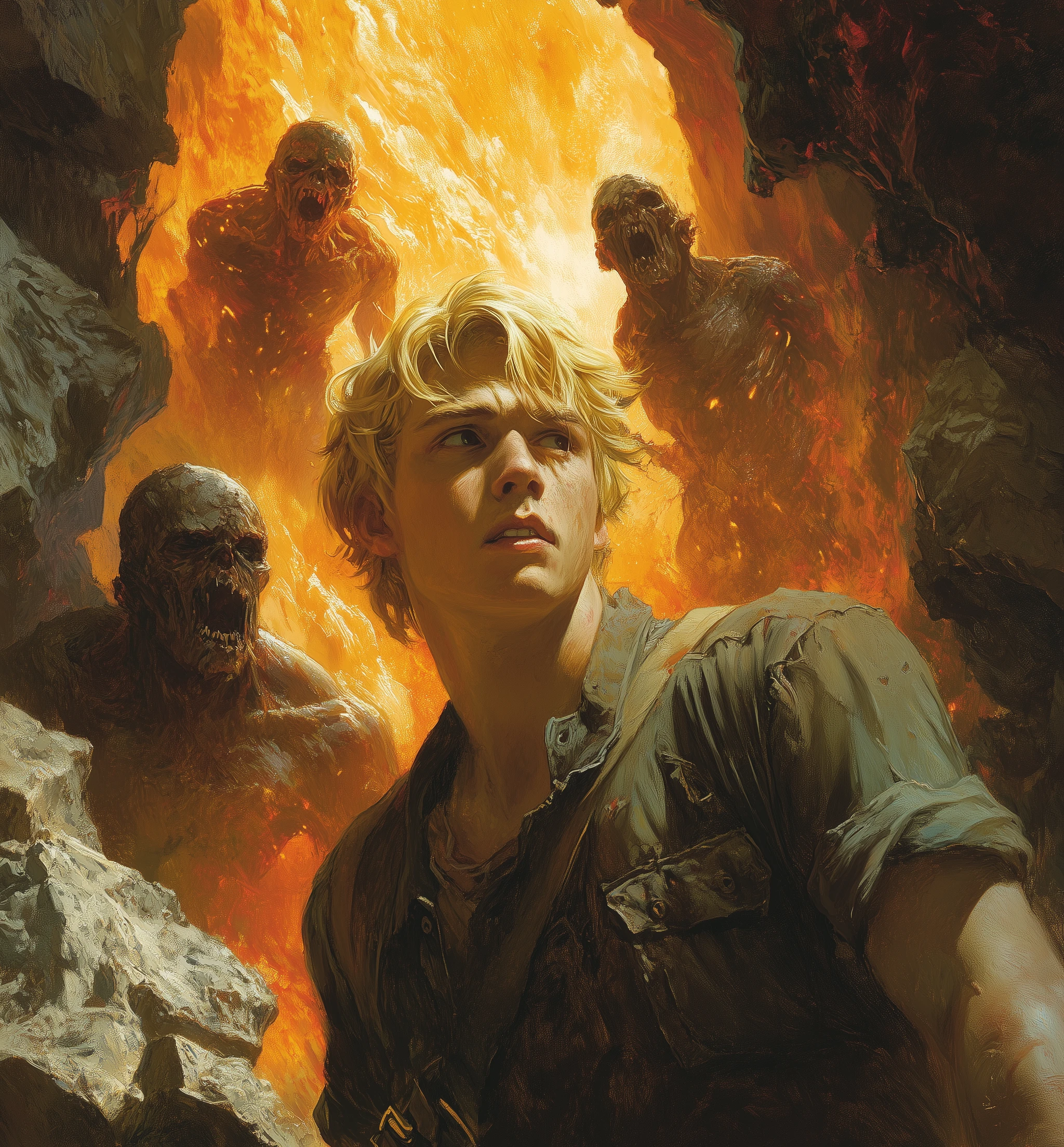 A young blond man with short hair is being attacked by three humanoid creatures in the style of Frank Frazetta, in a fantasy art style, as if for a fantasy book cover, with a dark cave background, orange and yellow lighting, and a red glow from behind him. He has his back to the viewer as the creatures approach, and there are rocks on top of them that look like ruins or broken statues. --ar 14:15 --style raw --stylize 250 --v 6. 1