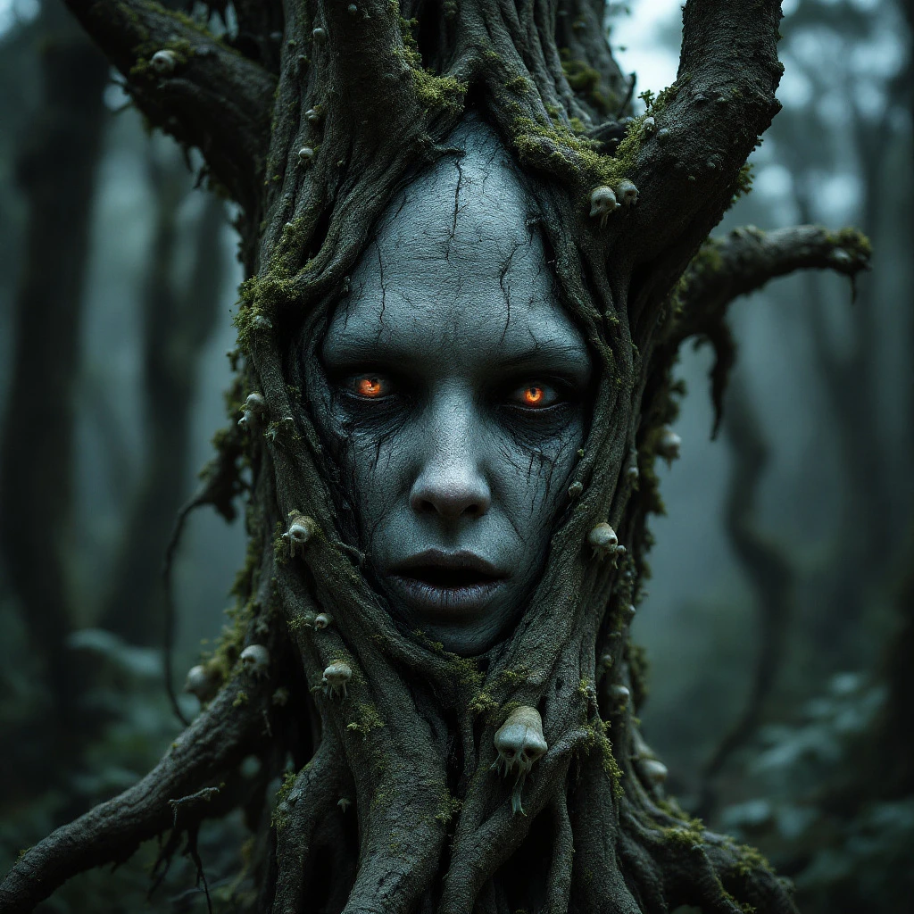 A haunting human face partially fused into the trunk of a decaying tree, infected and overtaken by parasitic cordyceps fungus, overgrown with grotesque fungal growths and moss, eerie forest background, post-apocalyptic atmosphere, nature reclaiming civilization, cinematic lighting, highly detailed, photorealistic, gritty texture, inspired by The Last of Us, dramatic shadows, horror-fantasy art. --ar 2:3 --stylize 750 --v 7