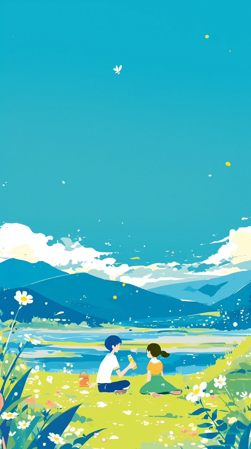 A boy and a girl drink bottled drink with mountains behind, Aerial view, simple lines, children's book style, flat illustration, by tatsurokiuchi, It has a fresh and peaceful atmosphere, 8k