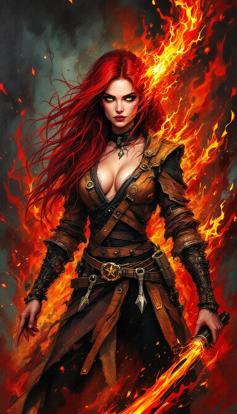 "Crimson Pyromancer in a Forged Vortex": A captivating abstract painting showcases a pyromancer, exhibiting both fierce power and a deep connection to the flames. She is a skilled manipulator of fire, shown within a space where flames seem to dance to her whim, with fair features, long, flowing crimson hair that seems to burn like fire, and a layered, practical outfit made of heat resistant materials. Fire tools, hot metals, and other items of her trade are clipped to her belt and held between her hands. The artwork combines modern abstract design and character portrayal, creating a chaotic and intense scene using a color palette of reds, oranges, and blacks. Her intense, green eyes, the focal point of the work, convey both a powerful will and a profound connection to the raw power of flames. After a long day of working with fire, the pyromancer embodies both a fierce skill and a creative passion. The dynamic forms and intense heat invite the viewer to uncover the hidden stories within this vibrant piece, presented as a painting.