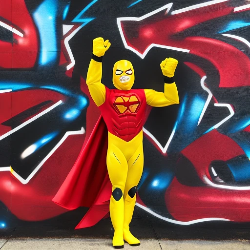 a red metallic superhero suit with gold gloves and yellow boots, black domino mask standing on a skycrapper, like a superhero with a red backwards baseball cap and holding two spraycans in front of the sky with graffiti with the word ZOZ.