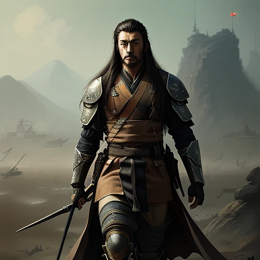 a painting of a man, [Ronin] with long hair, battlefield ready, poster by Wu Zuoren, cgsociety contest winner, fantasy art, official art, poster art, detailed painting