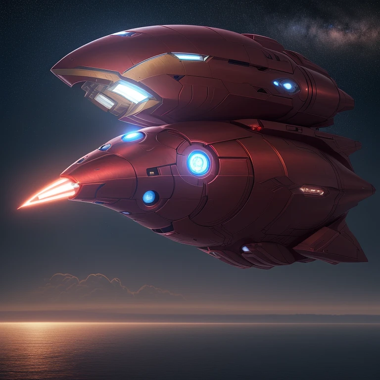 raw photo, spaceship shaped logo iron man like a metallic airship, flying over a reddish sea, close to the surface, night, stars in the sky, high detail, 4k, cinematographic lighting, wide shot, fantasy, digital art, photo, best quality, high quality, highres, detail enhancement, 8k, hdr, sharp focus