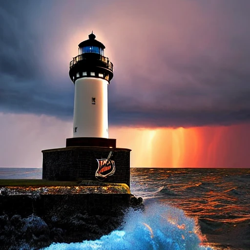 New York Islanders logo in front of a lighthouse shining on the ocean, storm, dark, lightning, crashing waves, 8k, hyperrealistic, night