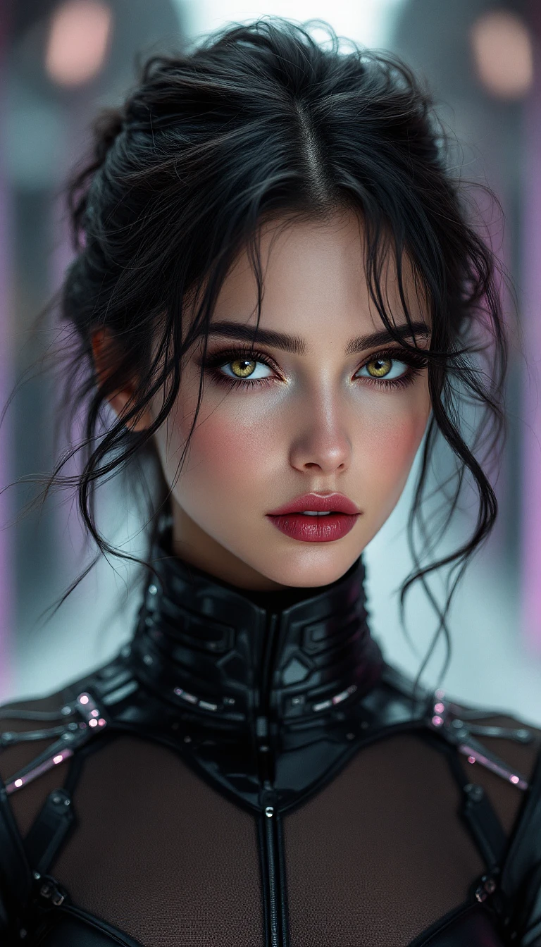 Russian girl realistic, female, full body, best quality, 6k, highres, masterpiece, ultra-detailed, realistic, highly detailed photo, fashion editorial, fashion photography, dark haired woman, beautiful eyes, black futuristic clothes, sharp focus, complex, highly detailed, cinematic, candid, true colors, creative, innocent, perfect, beautiful, elegant, intricate, confident, dynamic, volumetric lighting, cinematic angle, glamour vibrant,