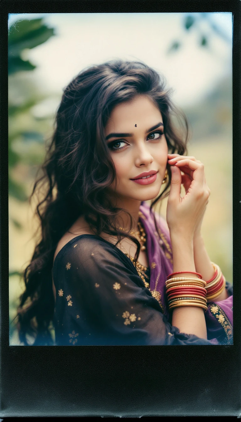 Polaroid camera, Hayley Atwell , 24-30 years old, Indian hair style, trying to love, showing bangles on hand, bindi, high-quality photo portrait, environmental, double eyelid --ar 34:65 --style raw, wearing violet transparent sari with black silk blouse, includes full body.