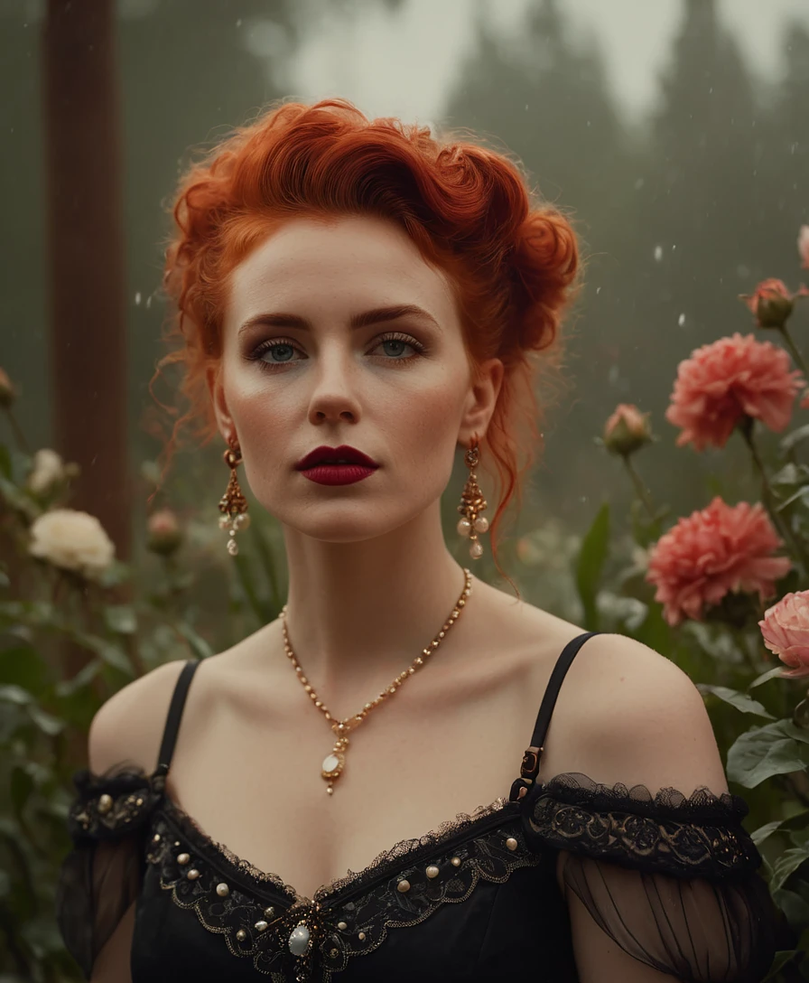 cinematic still {portrait of Victorian 80s punk woman with red hair, a splash of pastel colors, plants, and flowers, Tom Bagshaw} . emotional, harmonious, vignette, highly detailed, high budget, bokeh, cinemascope, moody, epic, gorgeous, film grain, grainy
