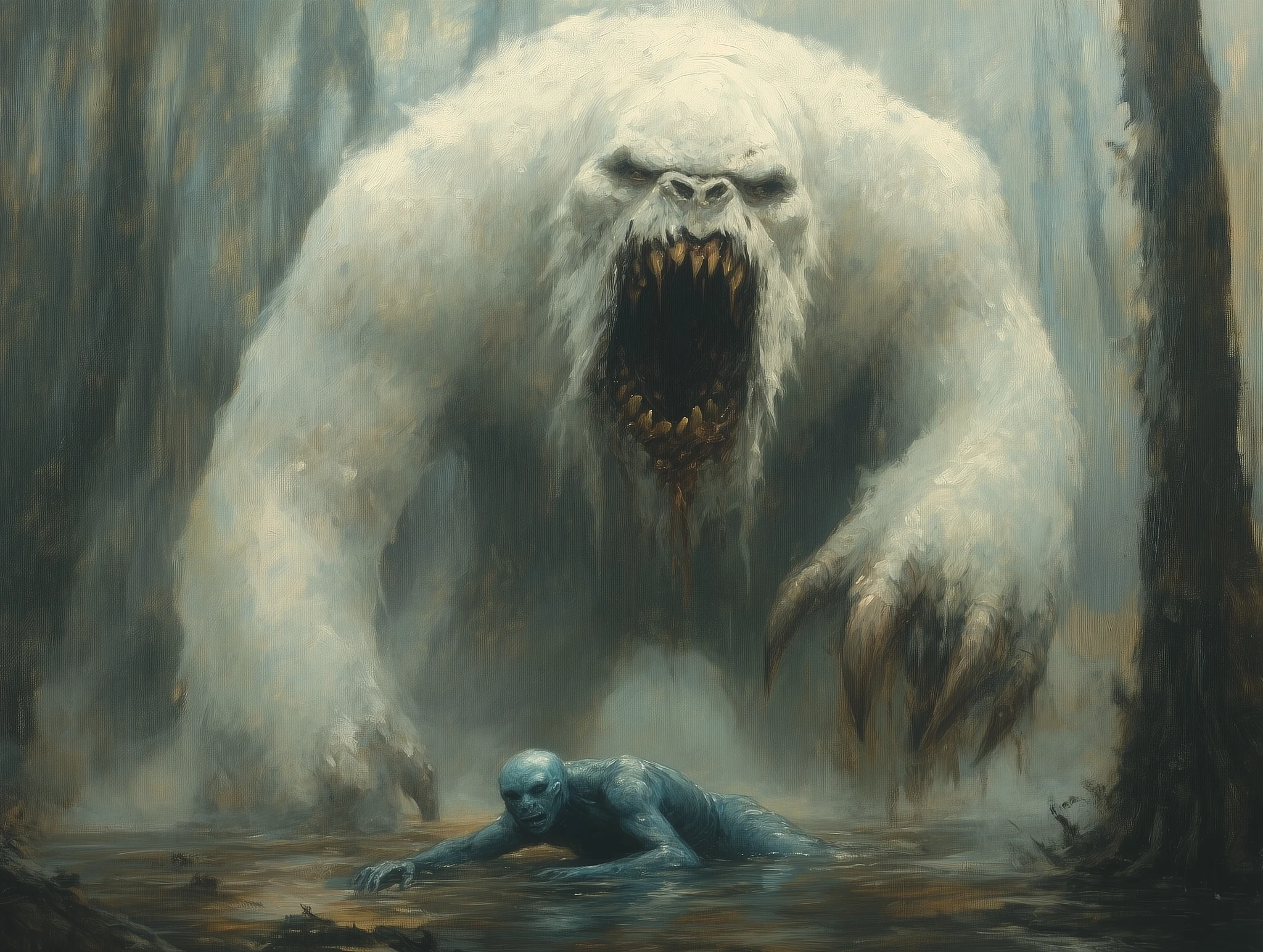 A white golem, standing in the water of an ancient swamp, with its mouth open and two large fangs dripping brown liquid. A blue-skinned alien is lying on its back at ground level next to it. The background features tall trees covered in fog. Painted in oil, in the style of Magic: The Gathering card art. --v 6. 1 --p 5144vto --s 250 --ar 4:3