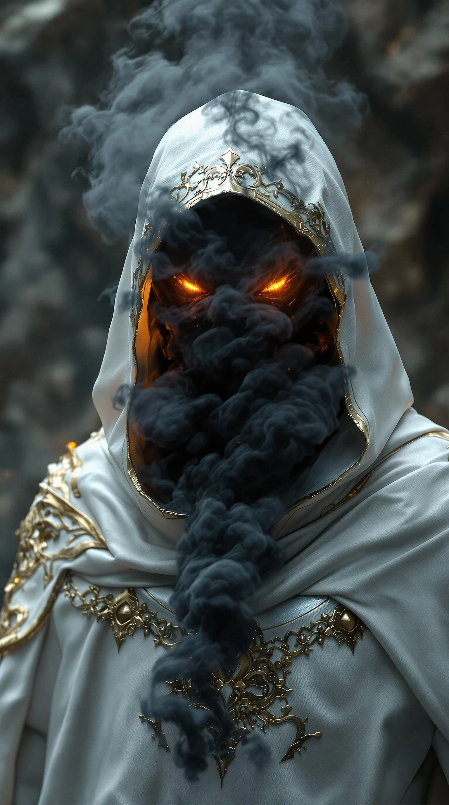 Dark fantasy, shadow knights, (( white and gold plug suit, black smoke in plug suit) ), (burning eyes:1) , (white, gold hooded cloak of leather material) , (fractal art:1.2) , cave background, transparency, caustics, optics, surreal, magic, masterpiece, perfect anatomy, 32k UHD resolution, best quality, highres, realistic photo, professional photography, cinematic angle, reflection lights, closed up, <lora:add-detail-xl:1.0>