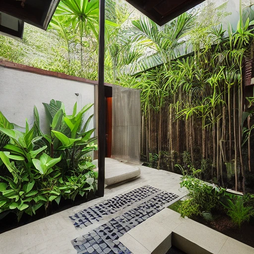 High resolution photography of modern enclosed lush balinese garden courtyard with outdoor shower small spa and dining area, magazine, cozy atmosphere; 8k, intricate detail, photorealistic, realistic light, wide angle, kinkfolk photography, A+D architecture