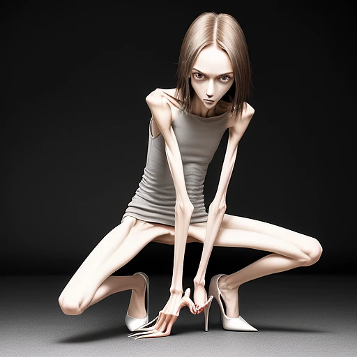 squatting position of extreme skinny slender anorexic girl very skinny slender girl, with long curved claws, skinny legs and long skinny calves in high heels,