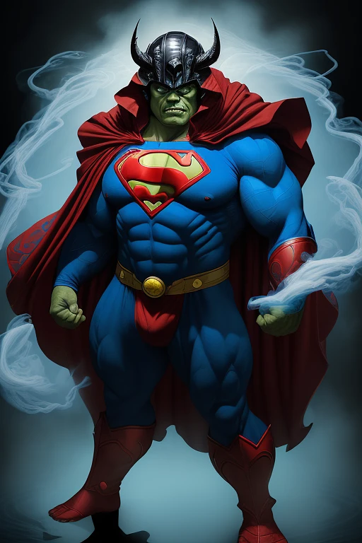 hulk, a formidable villain, real superman costume, full body shot, wears a deep blue and red costume with intricate patterns resembling flowing smoke, high-collar cape billows dramatically, ((distinctive helmet with a rounded fishbowl-like dome) ), conceals his face while housing swirling mist effects, enhance his illusionary powers