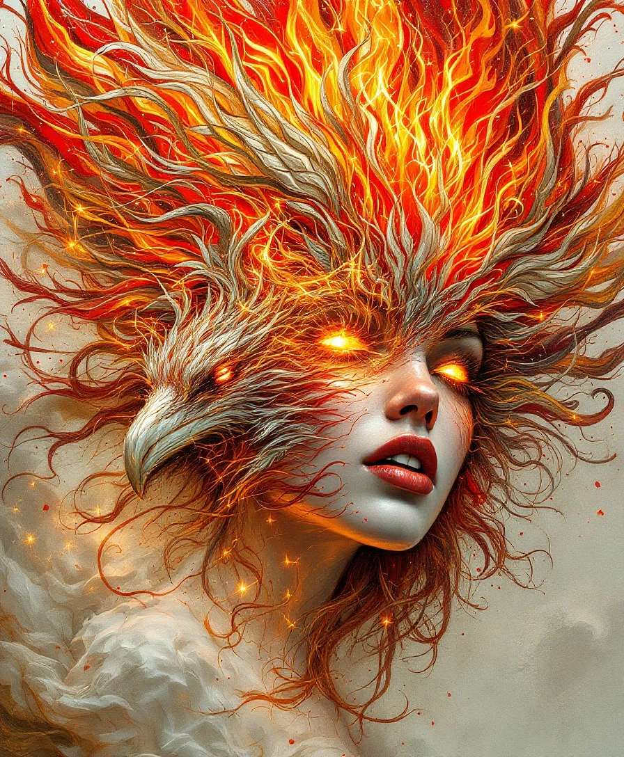 A stunningly intricate masterpiece art piece inspired by the work of renowned artists Luis Royo Rackham Krzysztof Lukasiewicz Annie Stegg Atkinson Grimshaw and Kopera The composition features a magnificent phoenix its flames and feathers rendered in vivid hues of red and gold while the head takes on the form of a beautiful woman with an astonished expression drawn in incredibly fine detail see