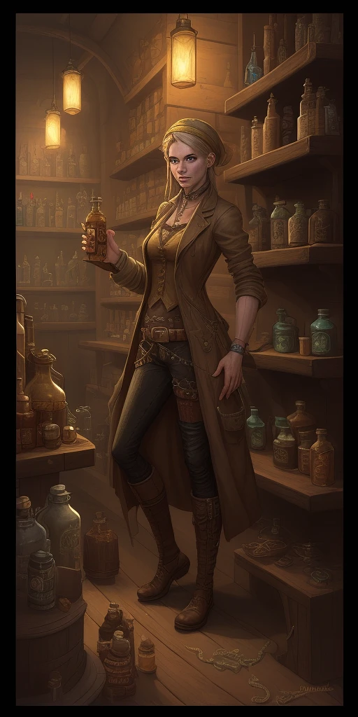 ((masterpiece:1.3,concept art,best quality,detailed) ), snake oil merchant, award winning illustration, solo, 1 girl