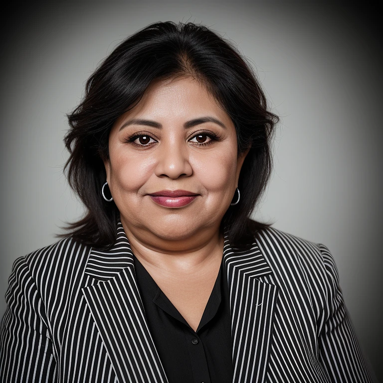 hyper realistic headshot photo of a 55 year old mexican woman, overweight, wearing a black white striped suit, looking into the camera smiling slightly