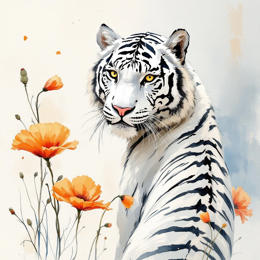 Prompt: Oil painting and alcohol ink combination. A [white tiger, looking back at us over its shoulder] with an intense gaze. Its body blends into the background. Artistic style. Vibrant orange poppies are visible on one side of the [tiger] . Fine black lines unfold. The background is a white and blue gradient, artistic. Here and there, beige brushstrokes.