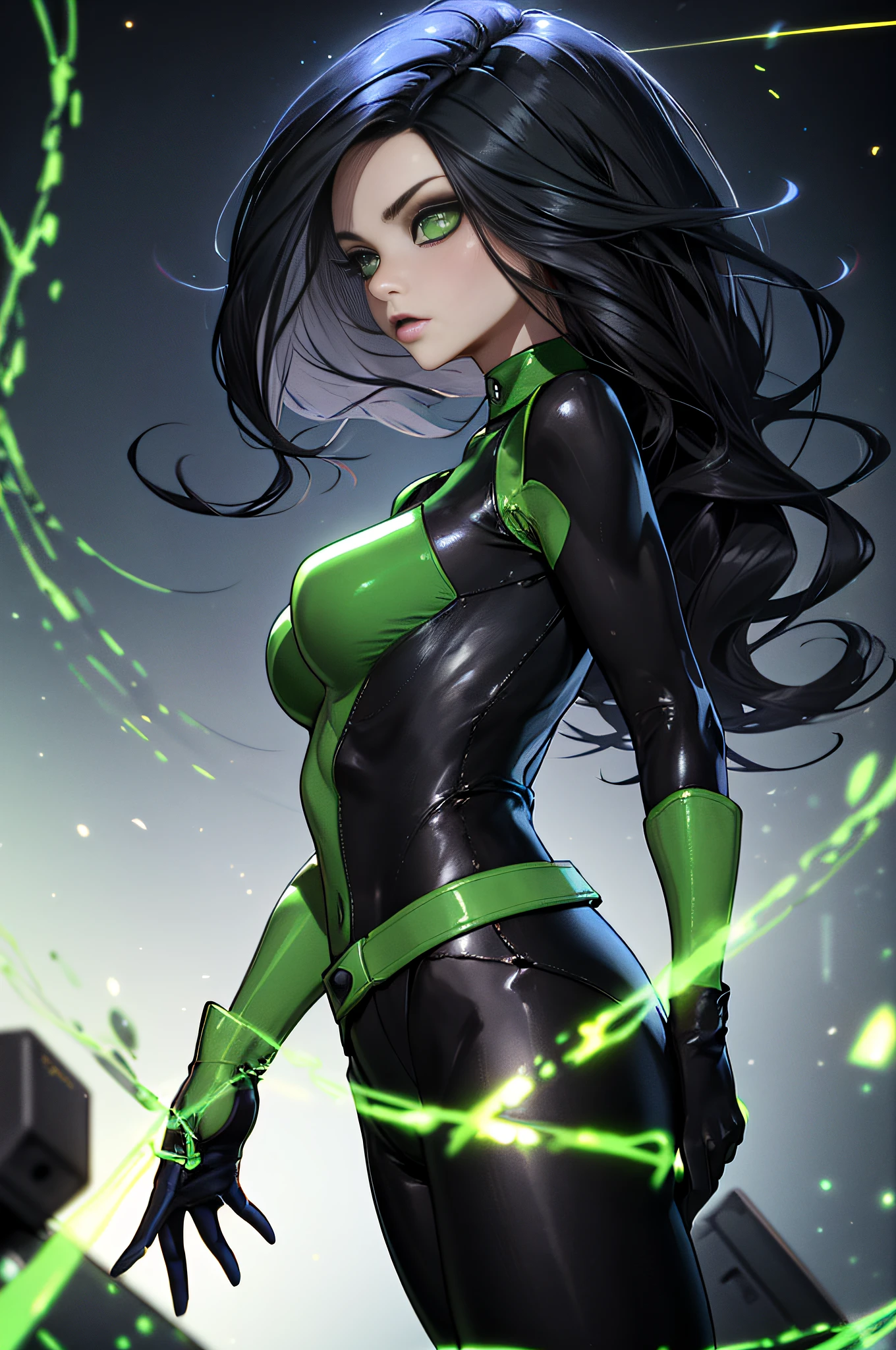 masterpiece, best quality, highres, sh1, green eyes, gloves, multicolored bodysuit, makeup, from side,