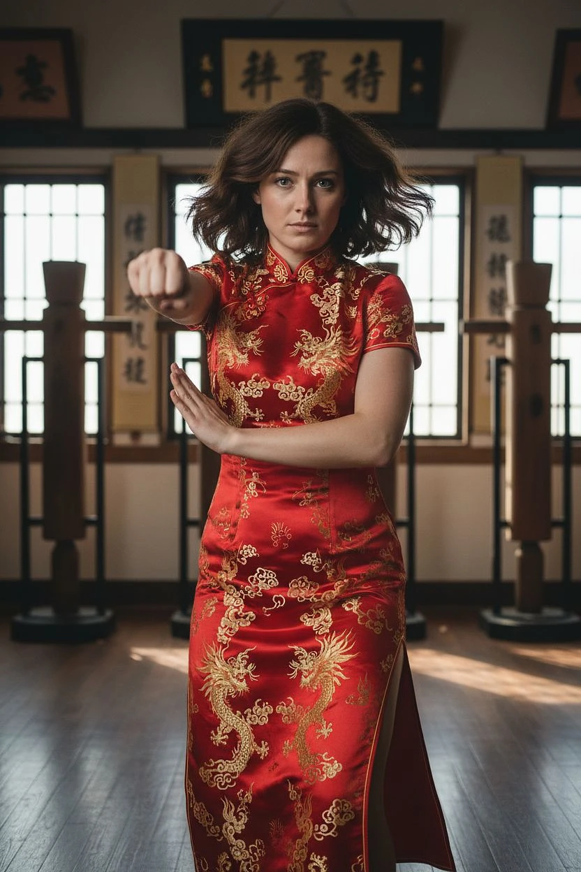 Full body image of the uploaded woman wearing a traditional red cheongsam with golden embroidery practices Wing Chun martial arts. She is focused and graceful, striking a defensive stance with one hand extended and the other guarding. Her hair flows naturally as she trains in a serene dojo with wooden Wing Chun dummies in the background. Cinematic lighting, ultra-detailed, realistic style, dynamic movement captured mid-action.