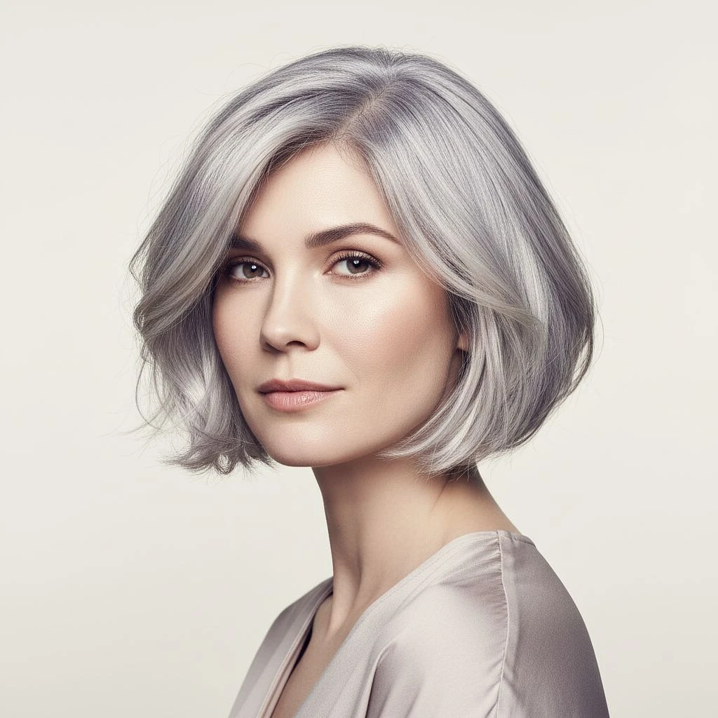 hair photography, woman, bob cut hair, silver color, ivory hue background, studio lighting setup, realistic details, soft highlighting natural hair texture, high-hair editorial style --ar 9:16 --quality 2 --style raw