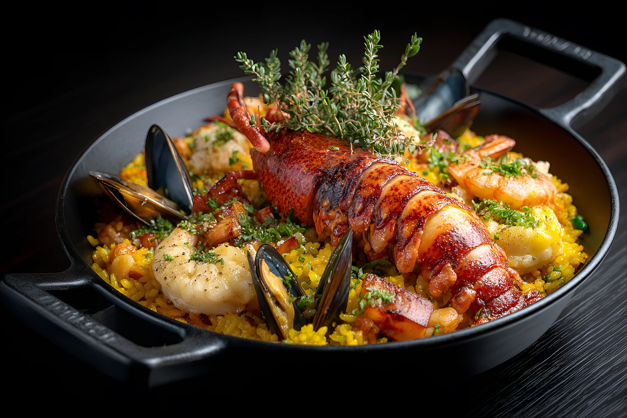 aesthetic top-down shot of a luxurious seafood paella served in a traditional Spanish pan, featuring succulent lobster tail, jumbo shrimp, and tender calamari atop a bed of saffron-infused rice. The minimalist composition emphasizes the vibrant colors and exquisite presentation of this gourmet dish, evoking a sense of indulgence and sophistication
