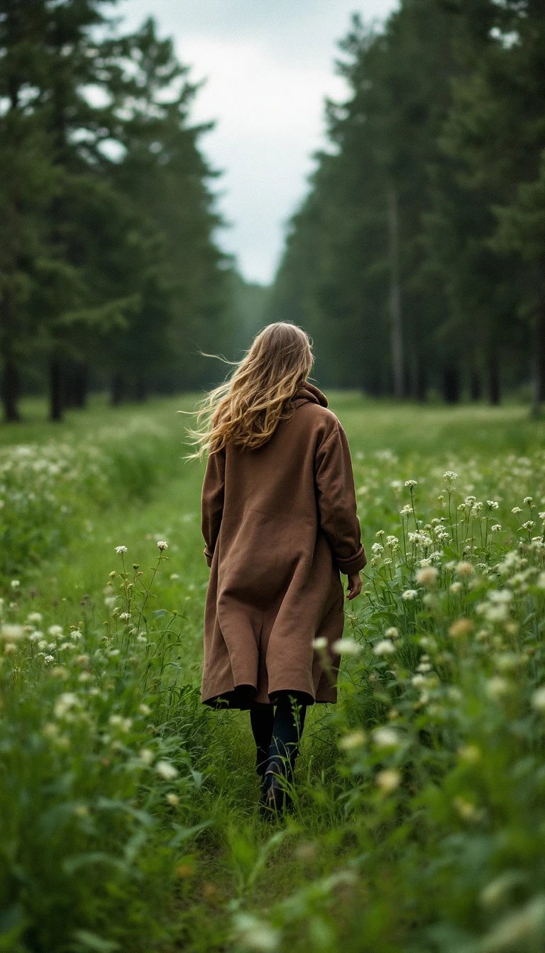 a woman walking through a lush green field, vogue fashion photo, brown tuffle coat, beautiful swedish forest view, mages, film still from dune 2020, britt marling style 3/4, patrick demarchelier, tarot card the hermit, sleek flowing shapes, by Cicely Hey, idyll, taupe, blond brown long hair