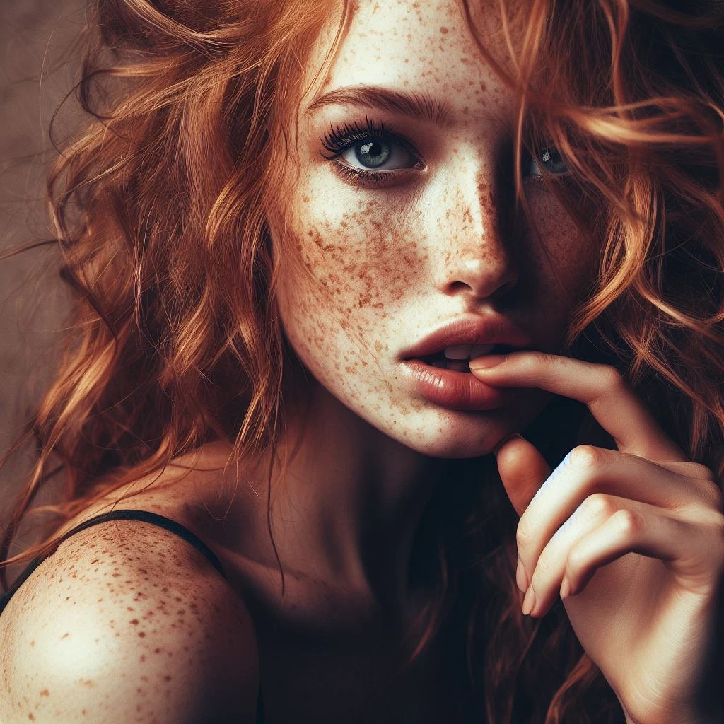 grunge style photograph of ginger female instagram model close up, beautiful, long curly hair, noticable face freckles, big blue eyes, wealthy jawellery, full lips, biting a fingertip, alluring, distressed, vintage, textured, shade plays