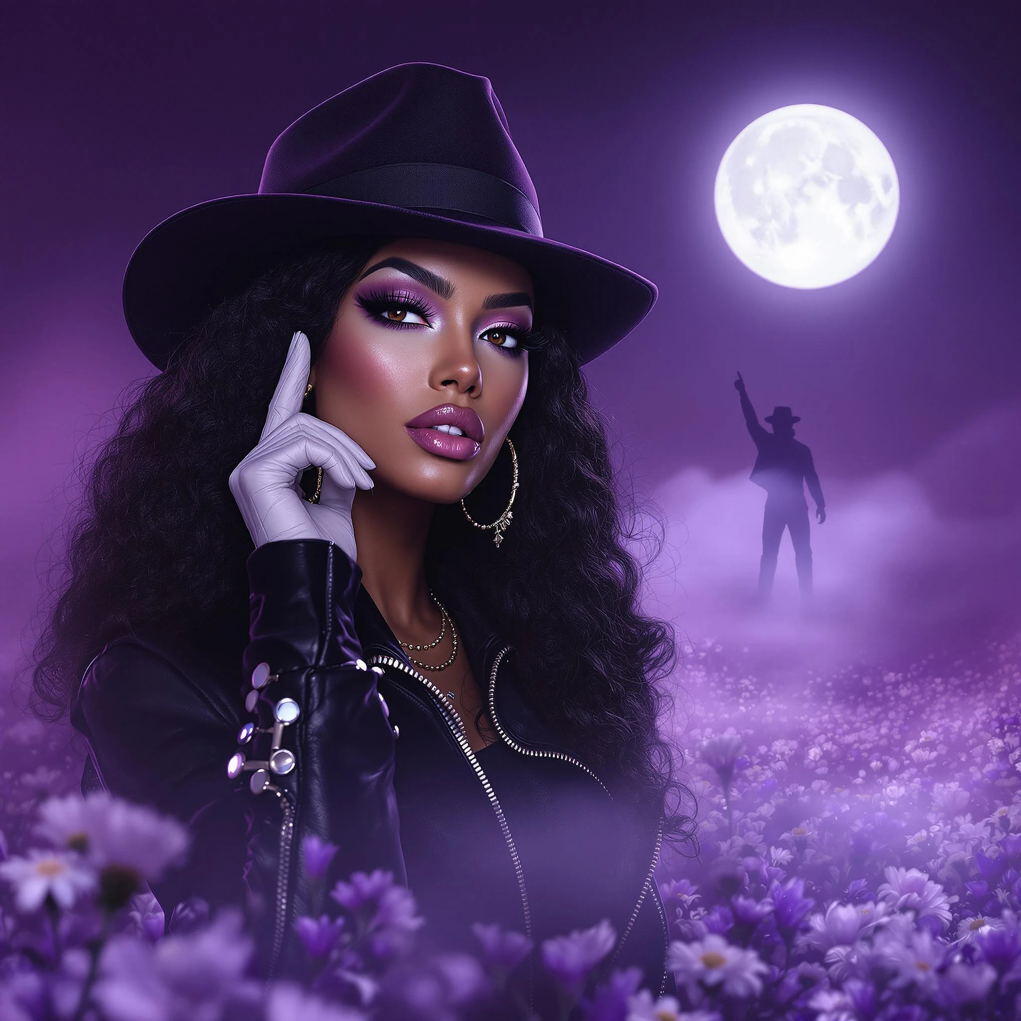Portrait of a stunning woman in the foreground, strongly reminiscent of Janet Jackson in her prime, with long, curly hair styled exactly like Michael Jackson’s signature look, wearing a stylish fedora hat and a single white glove, flawless skin, bold eyeshadow and a high-fashion black leather jacket with silver accents—bathed in soft purple moonlight, full moon glowing overhead above a misty flower field, subtle translucent silhouette of Michael Jackson in the background striking his signature one-gloved finger-point-to-the-sky and mid-moonwalk gesture—recognizable yet ethereal, cinematic lighting, hyper-realistic digital painting, 8K —ar 2:3 —v 5 —q 2