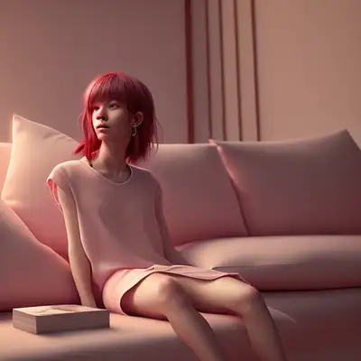 3d render inspired by wlop of a cute thin young, red blush, wearing casual clothes, small smile, relaxing on a couch, cuddling up under a blanket, cozy living room, medium shot, 8 k, octane render, trending on artstation, art by artgerm, unreal engine